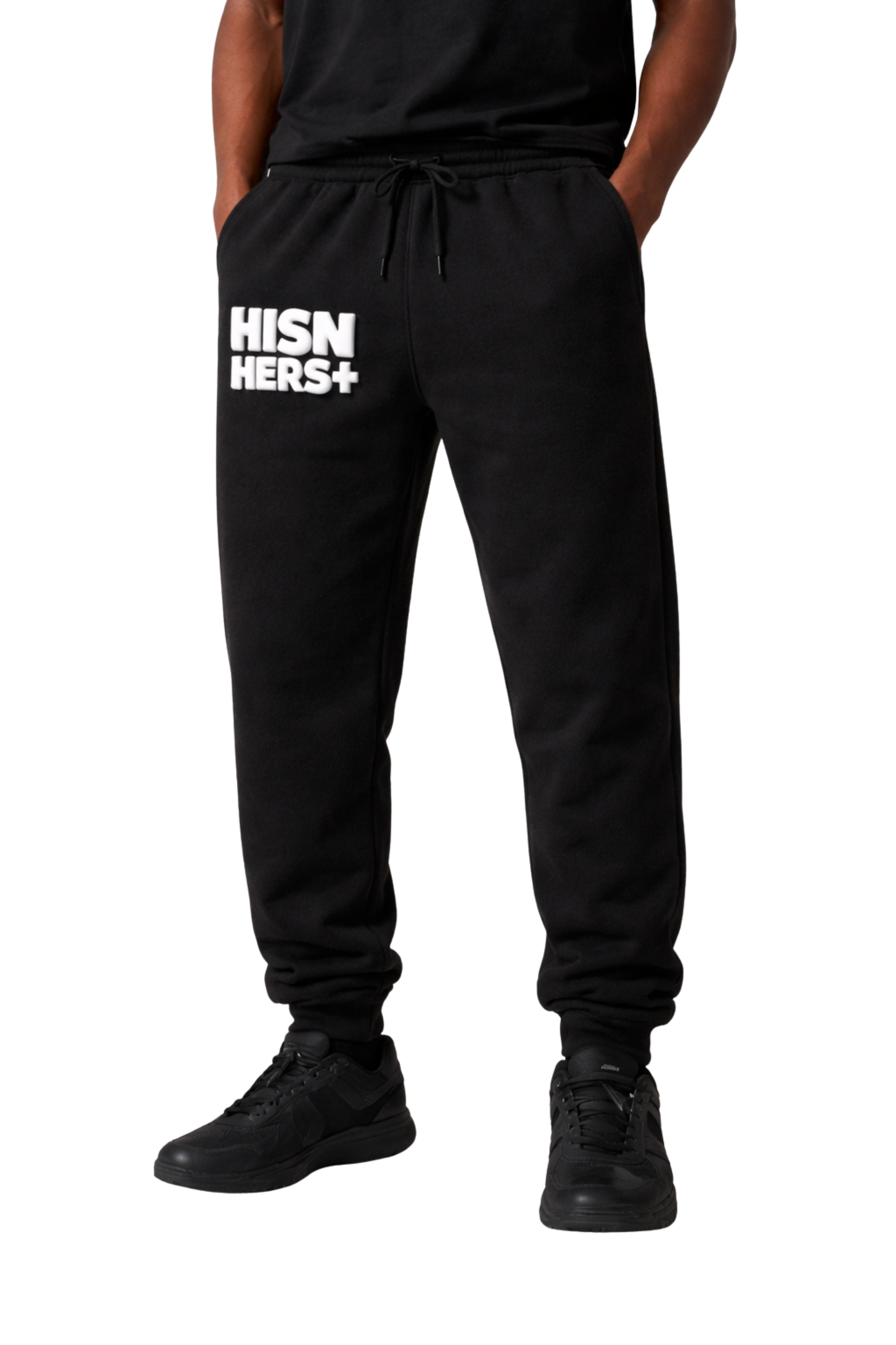 Branding: HISNHERS+ puff print on upper leg (raised 3D feel)