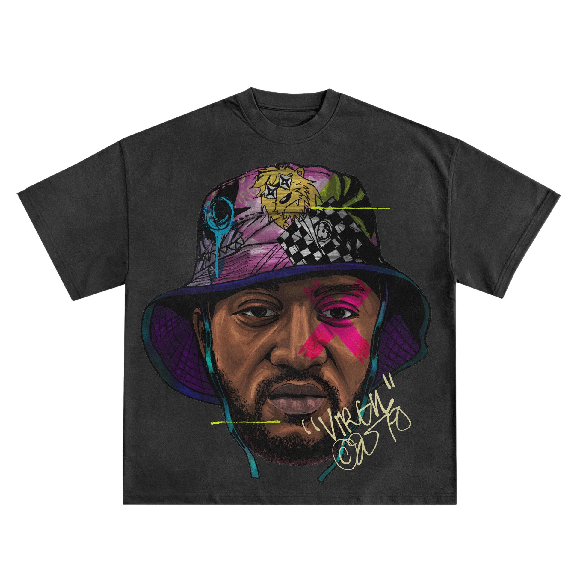 - VIRGIL ABLOH BUCKET HAT ON FRONT OF SHIRT